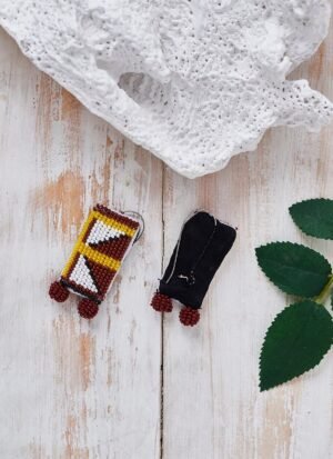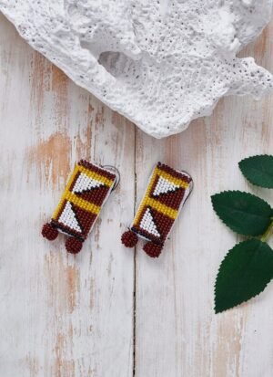 Hand crafted earrings with colorful glass beads intricately embroidered together to form a geometric pattern.