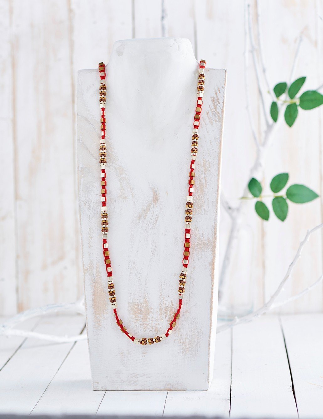| Material | Handwoven Dhokra necklace with copper, brass and silver coated brass beads and red cotton thread. |