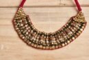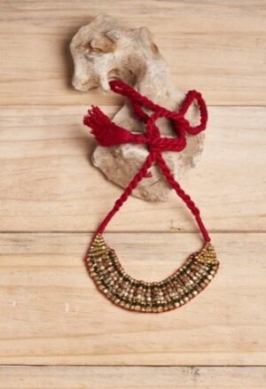 | Material | Earthy brass, copper and white metal beads necklace, handmade by the artisans of Odisha. Every piece has its uniqueness engraved through the creative making process which is held together with an adjustable maroon cotton thread. |