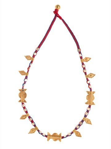 | Material | This beautiful Dhokra necklace, is handmade by the artisans of Odisha. Every piece has its uniqueness engraved through the creative making process which is held together with a red and blue cotton thread. |