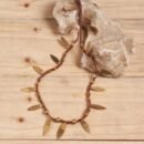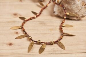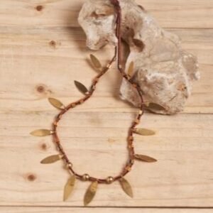 | Material | Tribal Dhokra necklace with gorgeous golden leaf motifs, handmade by the artisans of Odisha. Every piece has its uniqueness engraved through the creative making process which is held together with orange and blue cotton thread. |