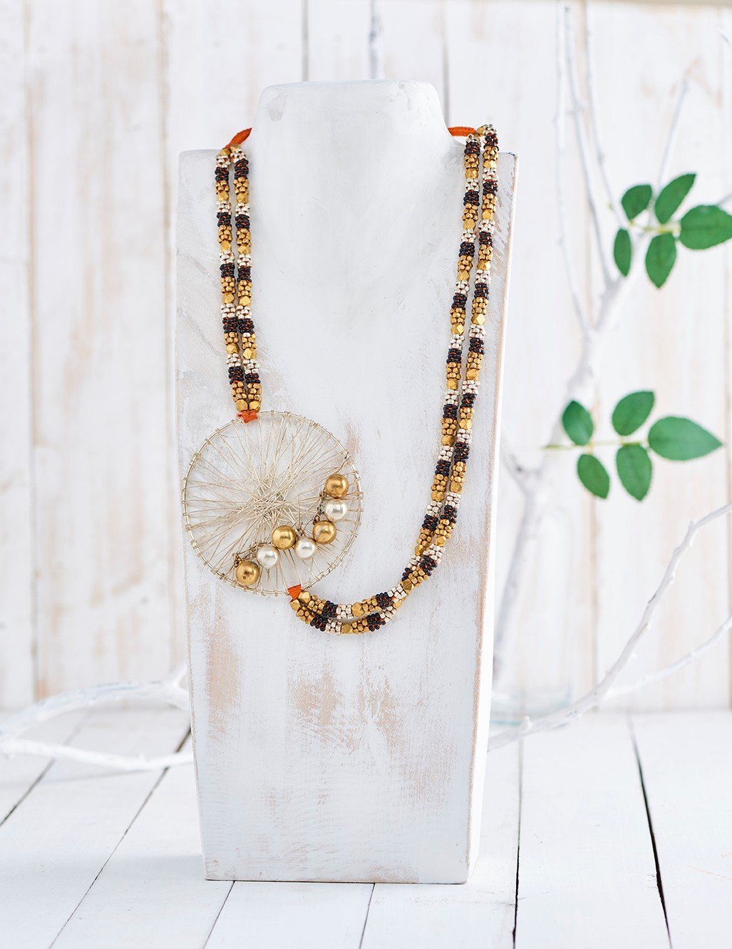 | Material | Tribal Dhokra necklace creating a bold statement with silver coated brass mesh pendant, brass and black glass beads and held together with adjustable orange cotton thread. |