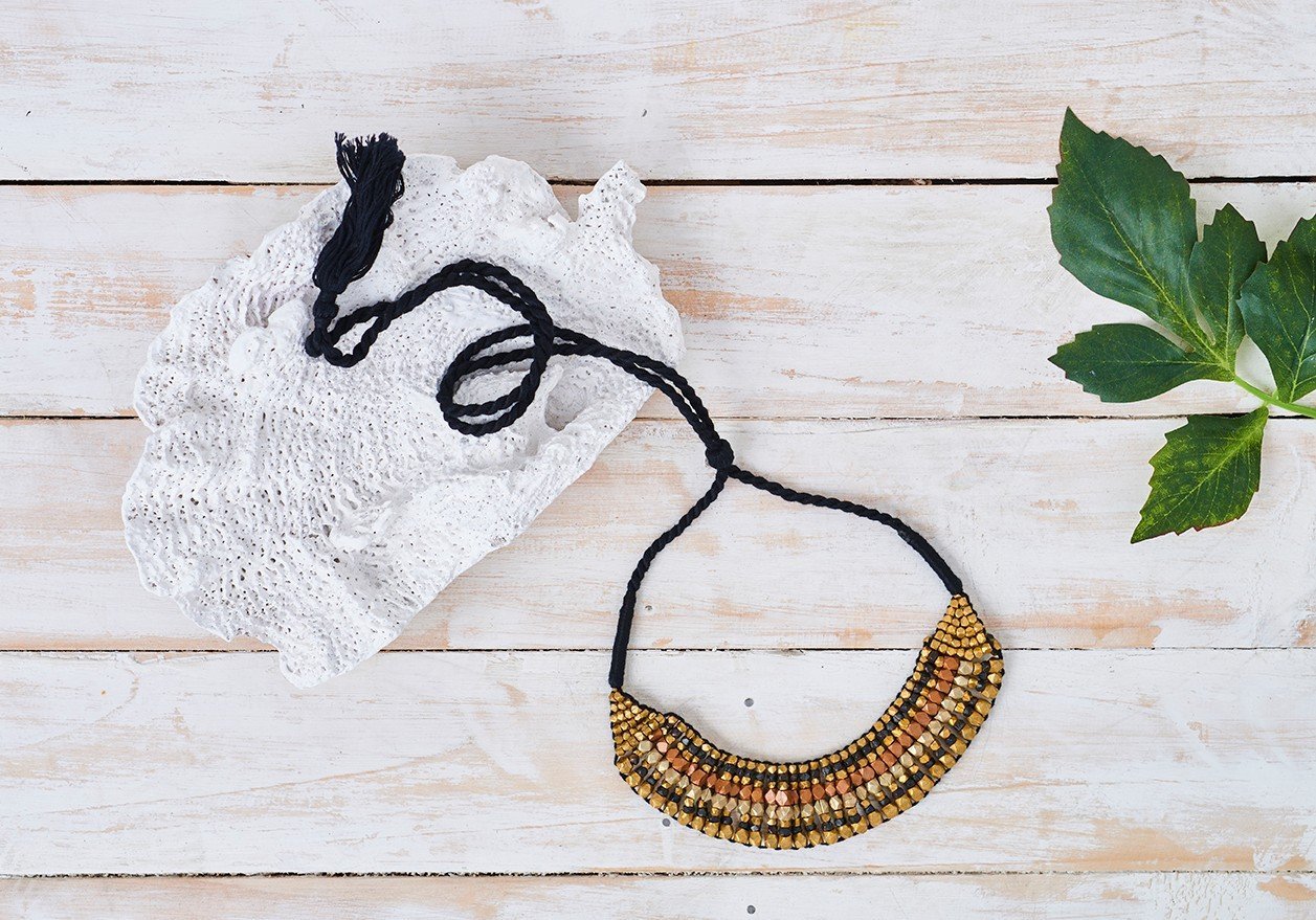 | Material | Dhokra necklace with brass, copper, oxidized brass and white metal beads balanced together forming a statement piece held together with an adjustable black cotton thread. |