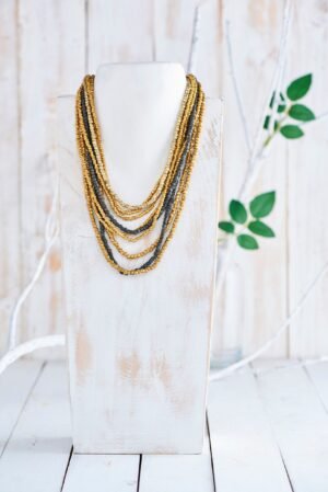 Handcrafted Dhokra layered necklace with brass and oxidized brass beads.