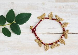 Paisley Dhokra anklet with golden metal alloy and maroon cotton thread.