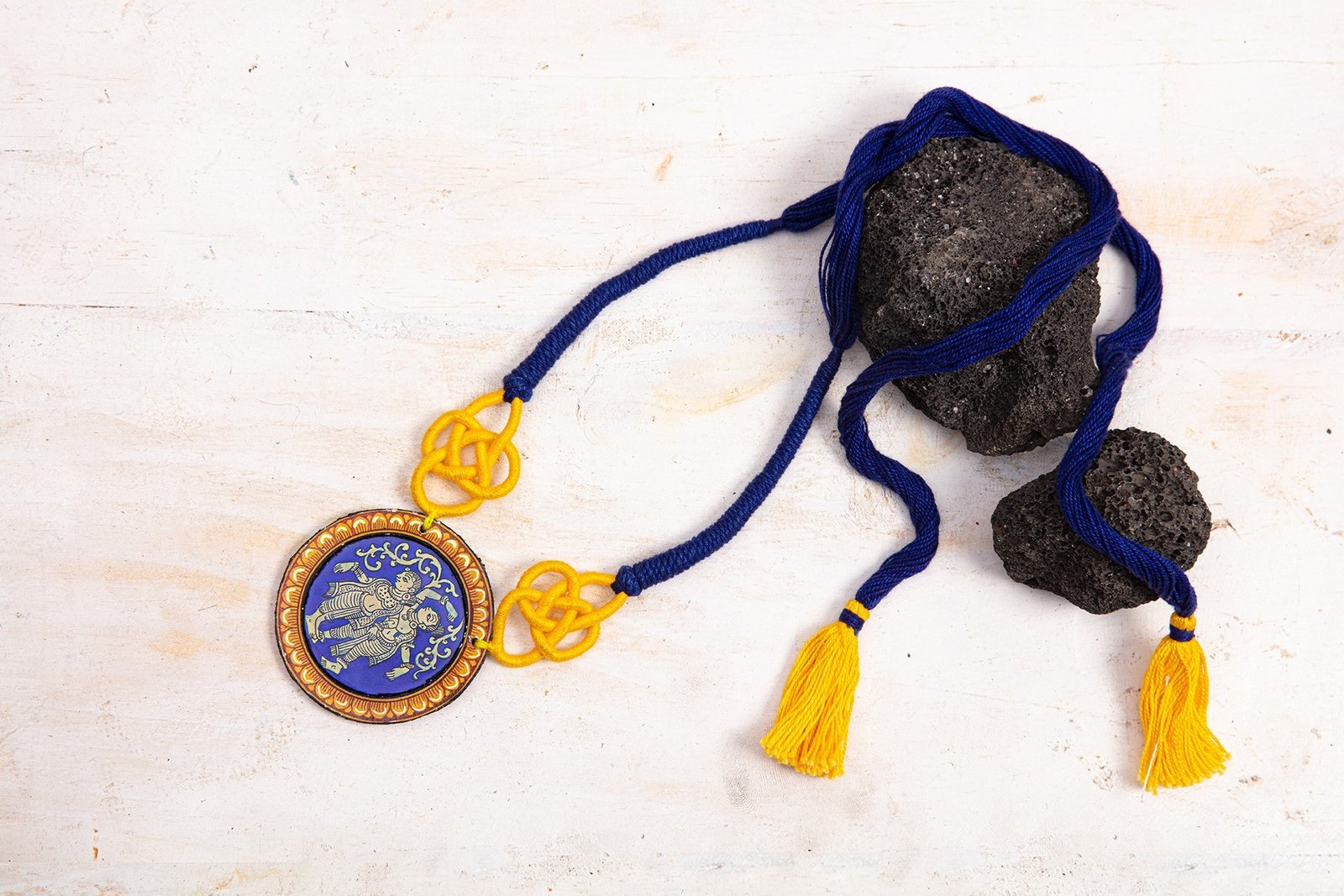 Hand – Painted glass encased Pattachitra necklace inspired by the Mithunas (couples in a loving embrace) and Devadasis (court dancers) sculpted in the Konark Sun temple