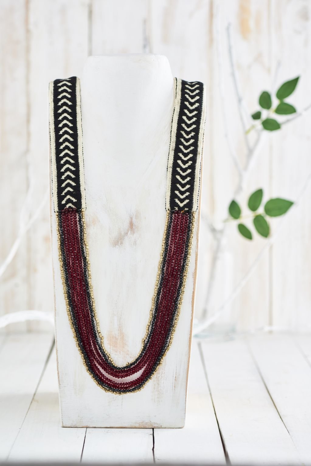Handwoven Toda embroidery cascading necklace with Dhokra white metal beads, burgundy and black crystal beads.