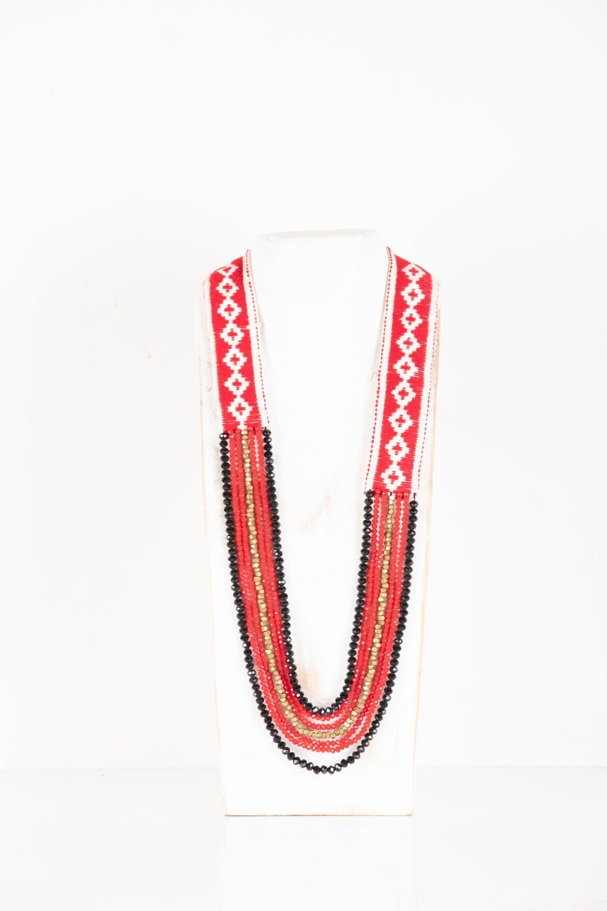 Handwoven Toda embroidery cascading necklace with Dhokra white metal beads, red and black crystal beads.