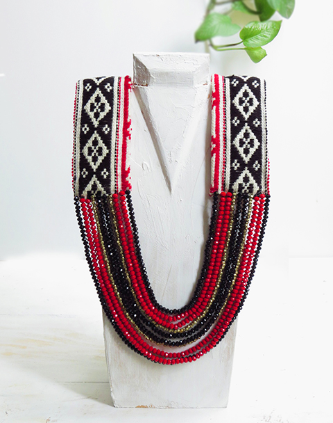 | Material | Handwoven Toda embroidery cascading necklace with Dhokra brass metal beads and burgundy crystal beads. |